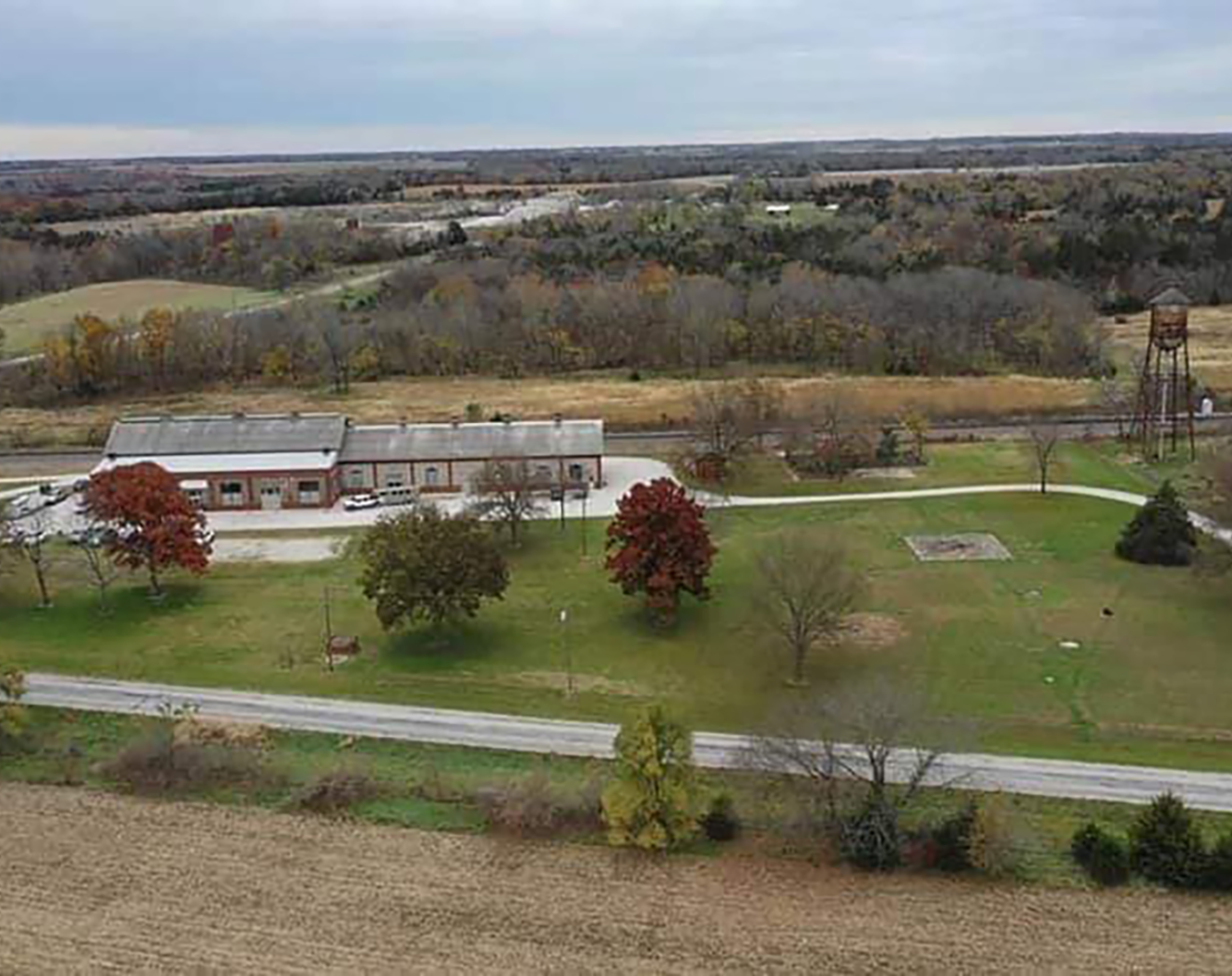 Original 1920s steel trusses, exposed brick, soaring 25+ foot ceilings, and a one-of-a-kind water tower backdrop.